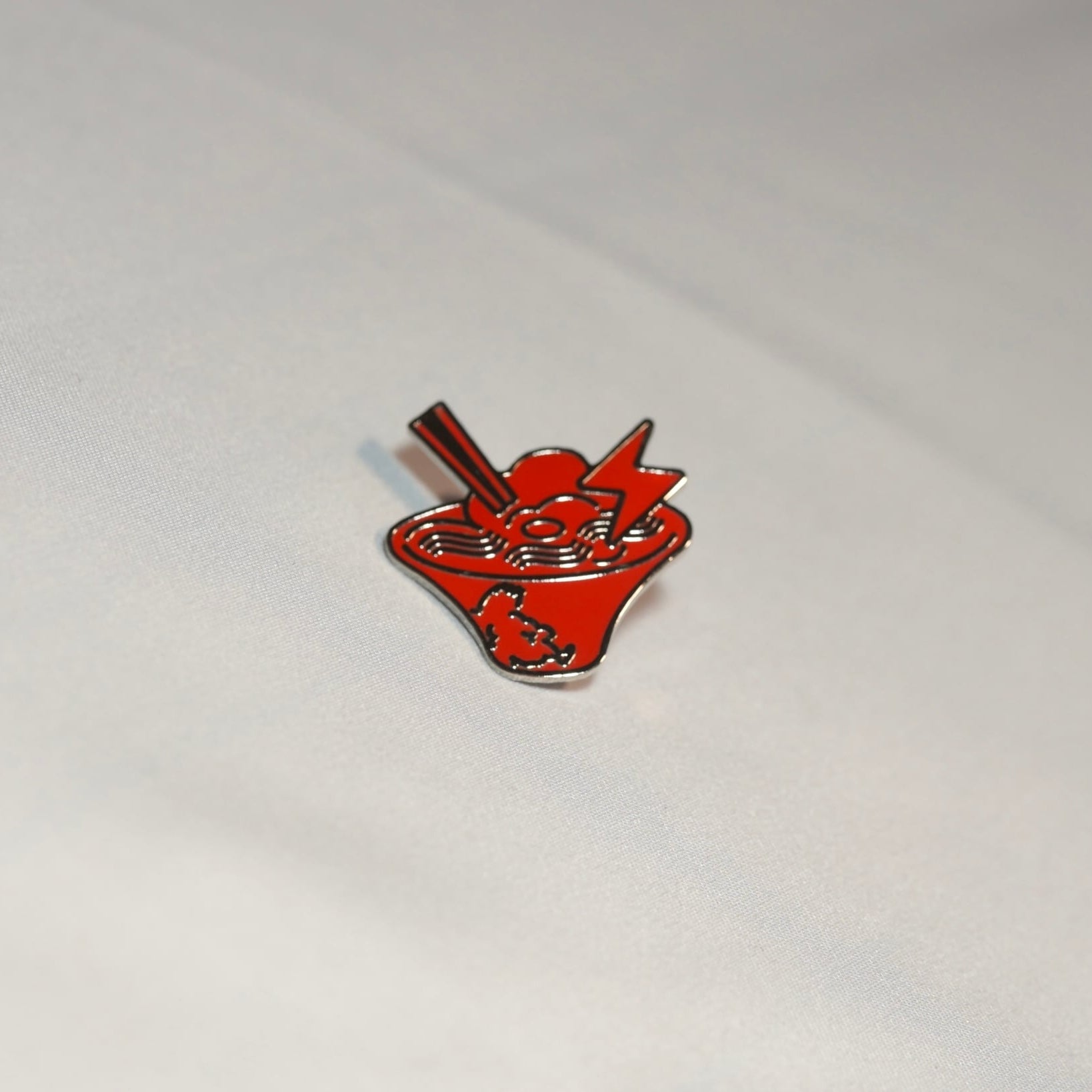 A playful and pop-style pin featuring hand-drawn illustrations of Raijin's ramen, bowls, and thunder.